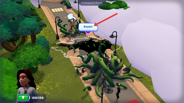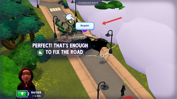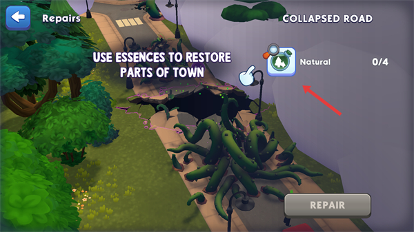 4、當精華足夠修復道路時點擊Repair按鈕完成修復,解鎖新的通行道路,繼續探索城鎮,完成更多修復和探索任務。