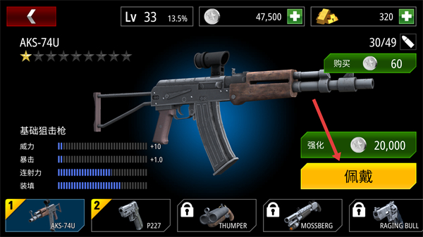 2、武器界面中選擇佩戴AKS74U等槍械強化武器可提升威力、暴擊等屬性,優先強化常用武器增強戰斗中的輸出能力。