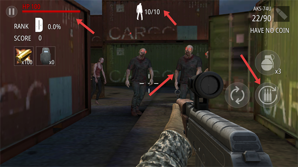4、關注HP和剩余敵人數量及時補充彈藥利用武器和道具消滅僵尸,提升得分和等級在戰斗中注意躲避敵人攻擊保持生存。