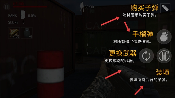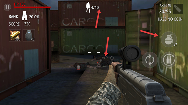 3、關注剩余僵尸數量利用槍械精準射擊消滅僵尸,合理使用手榴彈清理扎堆敵人,保持HP健康,爭取更高評分。