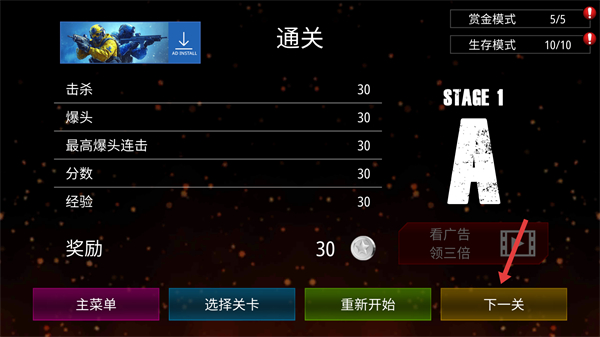 4、通關后點擊下一關繼續挑戰關注擊殺、爆頭數等數據,提升評分等級,積累經驗和獎勵,解鎖更多游戲模式和內容。