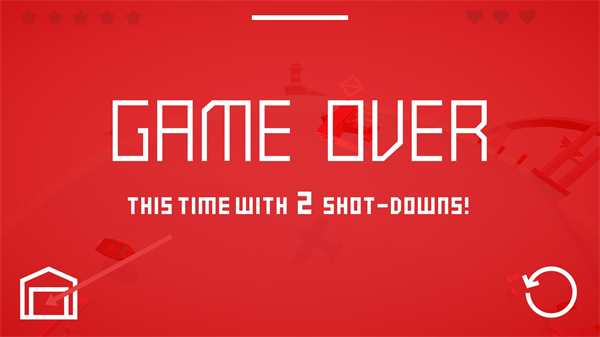 4、關卡失敗后顯示GAMEOVER界面,展示戰績2shotdowns,點擊重玩按鈕可重新挑戰關卡。
