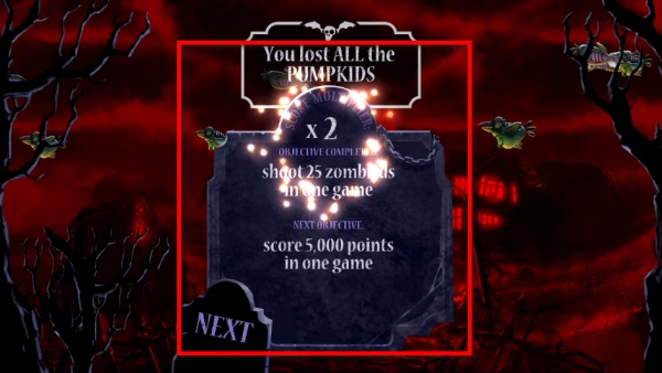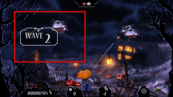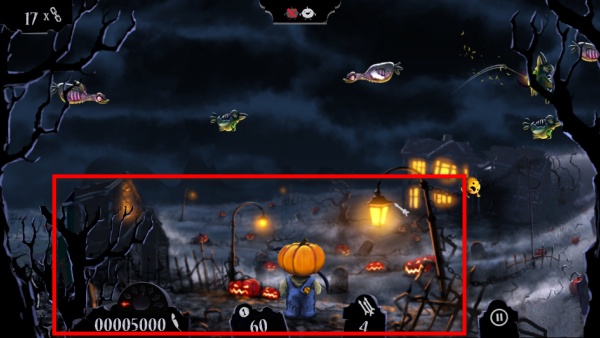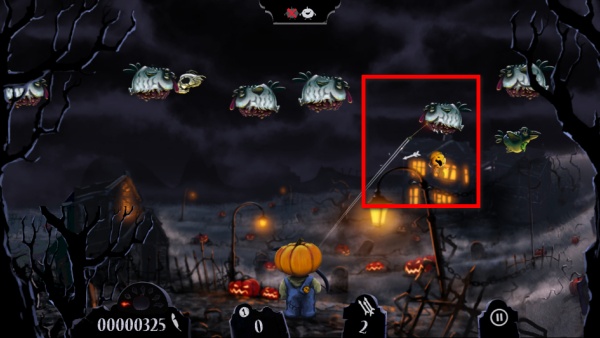 1、操控南瓜頭角色射擊空中的僵尸怪物,阻止它們靠近,擊殺怪物可積累分數,提升游戲成績。