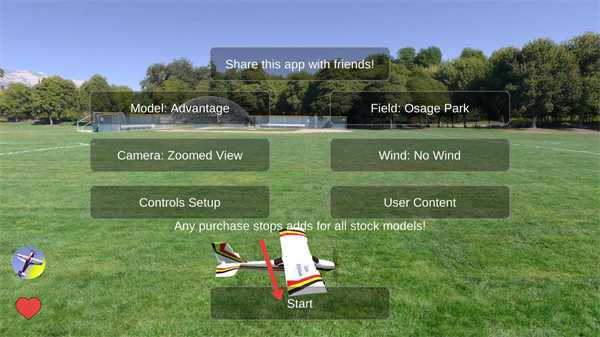1、選擇配置后點擊Start啟動飛行,當前機型為Advantage,場地為OsagePark,無風力干擾,適合新手熟悉操作。