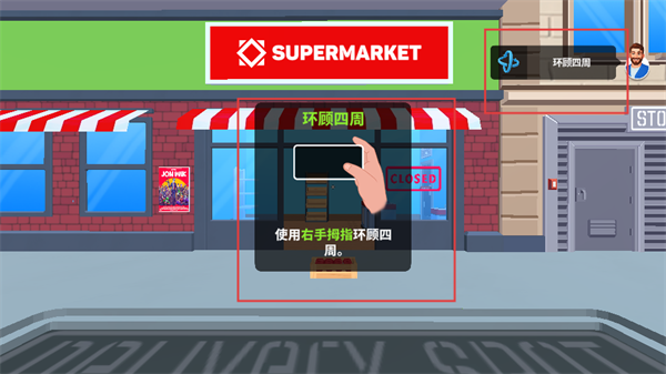 1、使用右手手指環顧四周,觀察超市環境,了解游戲場景布局,為后續操作做準備。