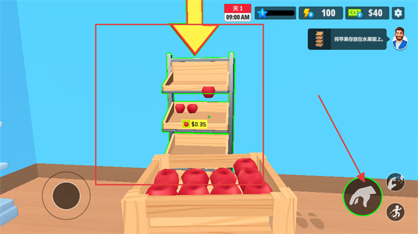 3、將蘋果存放在水果架上,整理商品陳列,提升超市的經營形象,推進游戲進程。