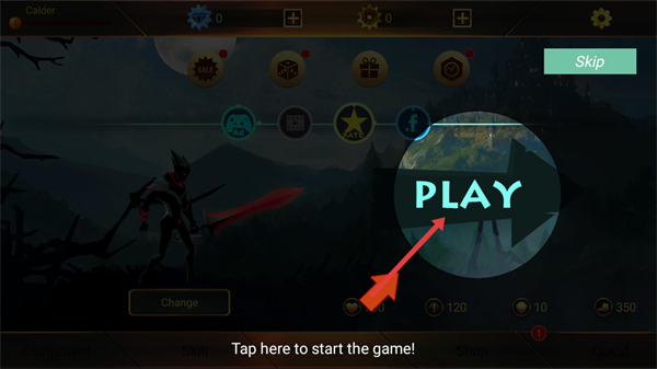 1、點擊PLAY按鈕進入游戲,當前角色為暗影戰士,界面可查看資源與功能入口,是進入關卡的核心操作。