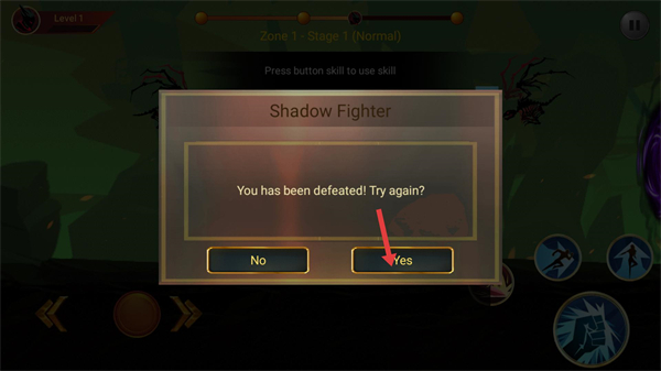 4、關卡失敗后彈出YouhasbeendefeatedTry提示,點擊Yes可重新挑戰當前關卡,調整策略再嘗試。