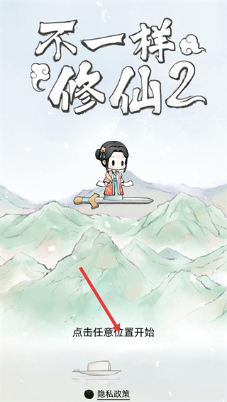 1、在啟動界面點擊任意位置,即可進入游戲,這是開啟修仙冒險的初始操作,界面同時顯示隱私政策入口。