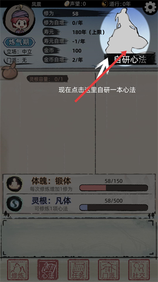 2、進入游戲后,點擊自研心法區域,觸發心法自研功能,這是提升修為、解鎖屬性加成的核心玩法之一。