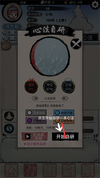 3、在心法自研界面選擇開始自研,消耗50修為與10年潛能,可生成隨機心法,心法品質與陣營屬性會影響后續加成。