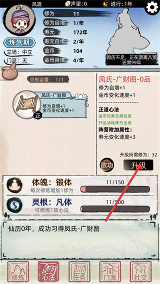 4、成功習得心法如鳳氏廣財圖后,點擊升級按鈕消耗修為,可提升心法等級,進一步增強屬性加成效果。