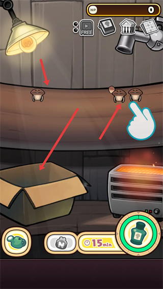 1、游戲開始時需點擊蘑菇進行收集將收集的蘑菇放入紙箱中,這是獲取資源的基礎操作,需反復執行以積累材料。