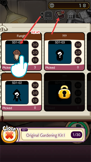 3、在圖書館界面點擊帶有NEW標識的蘑菇卡片,可查看蘑菇的收集情況,同時注意界面上方的提示圖標,及時了解新任務。