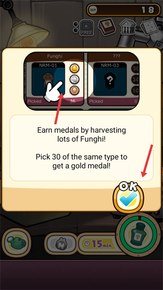 4、當出現關于收集蘑菇獲取勛章的提示時點擊OK按鈕確認,明確收集30個同類型蘑菇可獲得金牌的規則,以便后續有目標地收集蘑菇。