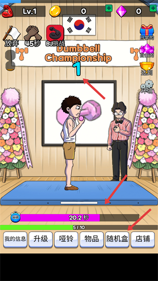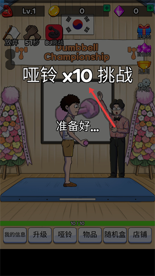 1、參與啞鈴10挑戰按照提示完成啞鈴挑戰任務,可獲取金幣和屬性提升,這是提升角色力量的重要途徑,助力后續掰手腕比賽。