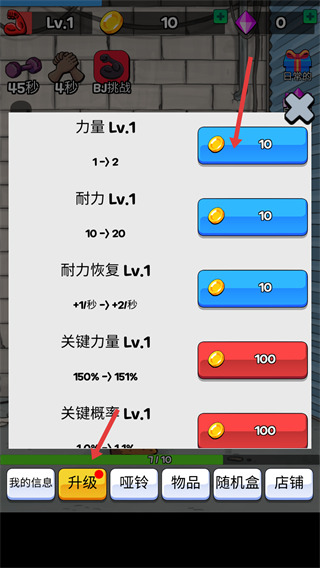4、點擊升級按鈕消耗金幣提升力量、耐力等屬性,優先升級力量和耐力,增強角色在掰手腕比賽和啞鈴挑戰中的競爭力。