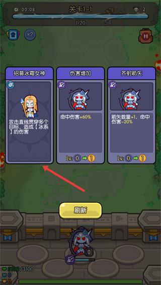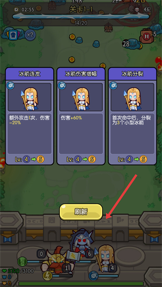 4、當出現技能選擇時根據當前角色和怪物情況,選擇冰箭連發、傷害增幅等技能,提升角色的輸出能力,若技能不合適可點擊刷新按鈕更換。