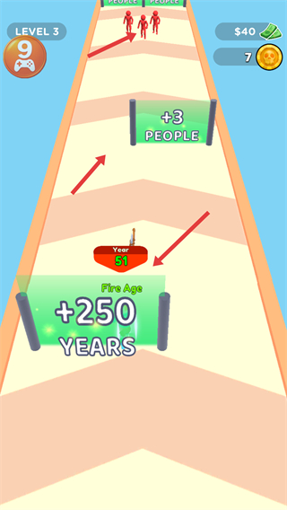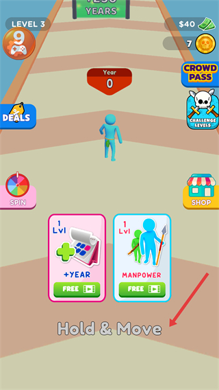 1、按照HoldMove提示長按屏幕控制角色移動,同時可利用免費道具提升年份和人力,為后續進化積累基礎資源,熟練掌握移動操作是游戲的關鍵起步。
