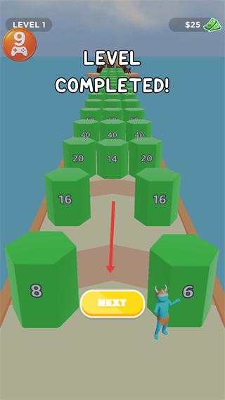 4、關卡完成后點擊NEXT進入下一關,繼續挑戰更難的關卡,通過不斷通關積累金幣和資源,解鎖更多道具和角色,提升整體游戲體驗。