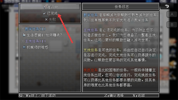 3、在任務界面選擇已完成標簽,可查看任務分類教學、主線、支線、挑戰,新手建議優先完成教學任務以熟悉生存機制。