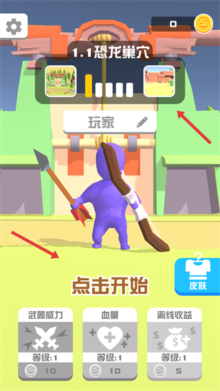 1、點擊開始進入關卡,該作是恐龍題材生存戰斗游戲,可升級武器、血量等屬性,提升戰斗能力以應對恐龍敵人。