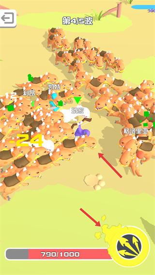 3、在恐龍潮中點擊技能按鈕釋放群體攻擊,可快速清理大量恐龍敵人,是應對波次進攻的核心操作。