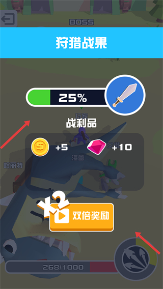 4、狩獵結束后可領取戰利品,點擊雙倍獎勵可獲取更多資源,這些資源用于升級屬性、解鎖新內容。