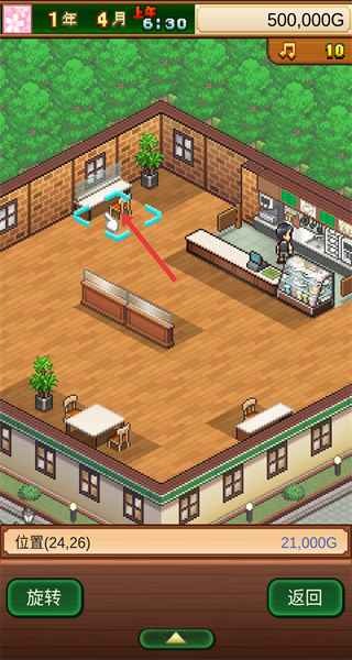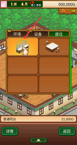 3、在菜單中選擇座位、設備等設施,花費資金進行購置,為咖啡店增添各類經營所需物品。