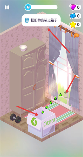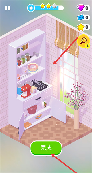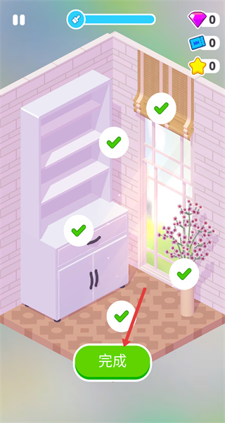 4、完成房間整理后,點擊完成按鈕,獲取獎勵,繼續推進游戲進程,開啟新的房間改造任務。