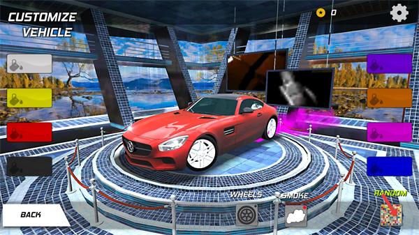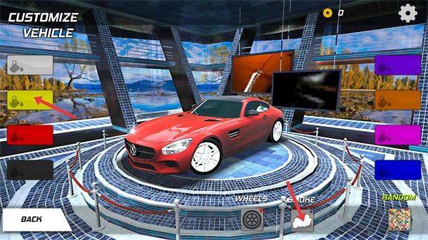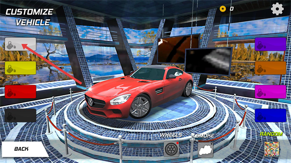 1、在車輛選擇界面點擊CUSTOMIZE進入自定義界面,該功能可調整車輛外觀如車輪、煙霧,是個性化賽車的核心入口。