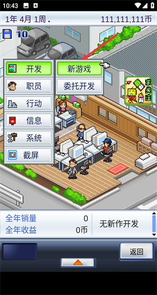1、點擊新游戲,進入游戲開發公司的經營界面,開啟游戲開發的創業之旅。