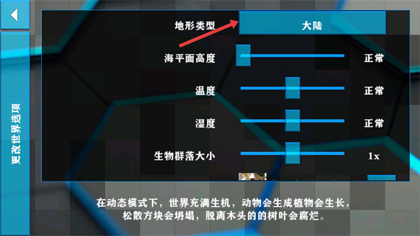 3、進入更改世界選項界面后,可調整地形類型、海平面高度等參數,當前地形類型選【大陸】。