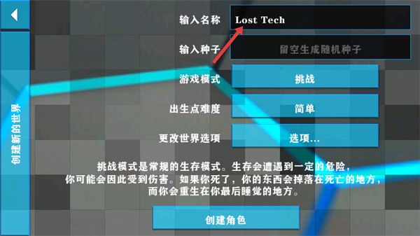 2、進入創建新的世界界面后,可輸入名稱、種子,選擇游戲模式與出生點難度,新手可選【簡單】出生點難度。