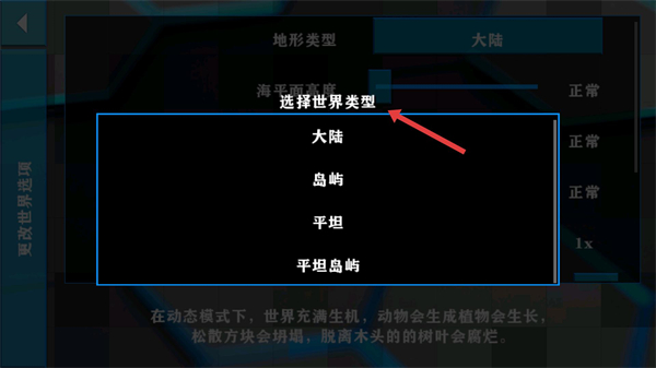 4、點擊地形類型后彈出世界類型選擇框,有大陸、島嶼等選項,新手優先選【大陸】,提升生存效率。