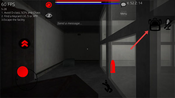 2、進入游戲場景后,左側顯示任務目標,右側背包按鈕可查看物品,優先操控角色在走廊探索,同時留意周圍潛在威脅。