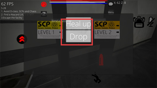 4、交互物品后彈出操作選項,【Heal up】可恢復狀態,【Drop】可丟棄物品,建議優先選擇恢復功能維持生存狀態,保留關鍵物品如門禁卡,助力后續逃離設施。