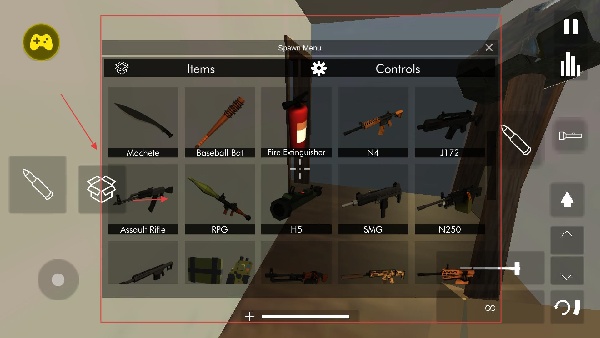 3、當玩家進游戲后,可開SpawnMenu,可選砍刀、突擊步槍等道具,按需求選裝備,Controls可調操作設置,適配習慣。