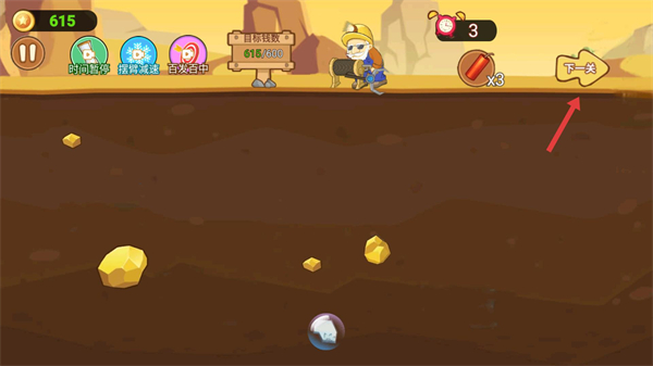 3、完成當前關卡的挖掘任務后,界面顯示過關提示,點擊下一關按鈕,進入下一個關卡繼續進行挖掘操作。