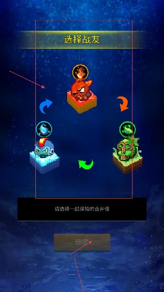 1、界面為選擇戰友環節,可挑選不同屬性的合并怪作為探險伙伴,選好后點擊確定即可進入游戲,不同戰友的屬性會影響后續戰斗策略。