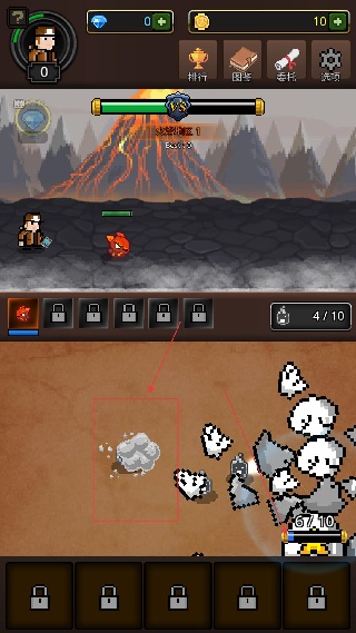 3、進入火焰地區1的戰斗場景,已召喚的合并怪會自動攻擊敵人,同時可收集場景中的資源,資源積累可用于后續怪物的合成與升級。