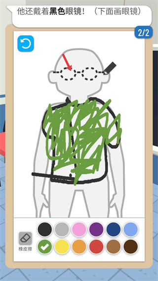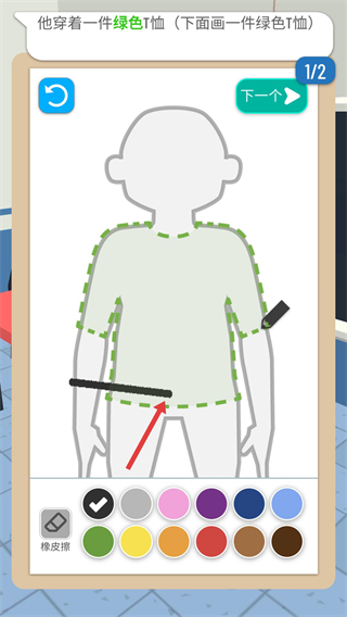 2、根據提示要求,在畫板中選擇綠色顏料,填充T恤區域完成描述匹配,這是還原嫌疑人特征的核心操作之一。