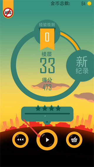 4、關卡結束后會顯示金幣總數、經驗級別、樓層與得分,當前達成新紀錄,點擊中間按鈕可重新開始挑戰,繼續積累樓層與得分以提升經驗級別。