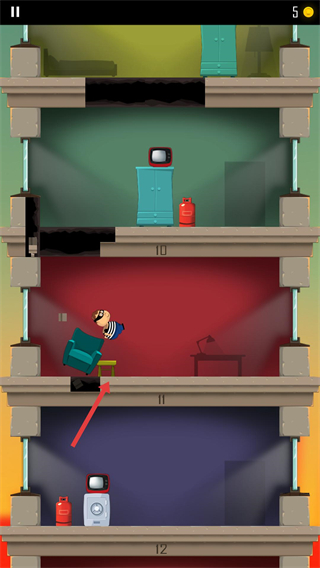 2、操控角色在樓層間移動,按箭頭指引方向避開障礙物、碰撞家具,同時收集場景內的物品,每通過一層會顯示對應層數,持續向下推進可積累進度。