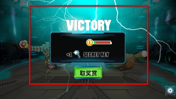 4、獲勝后顯示勝利界面,獲金幣和秘密鑰匙獎勵,點擊取獎賞按鈕領獎勵,參與對戰積累獎勵,解鎖更多內容。