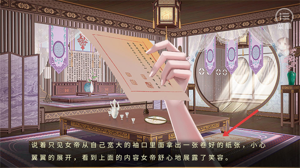 1、了解女帝展開紙張后的情節,跟隨劇情推進,等待后續的互動選項出現。