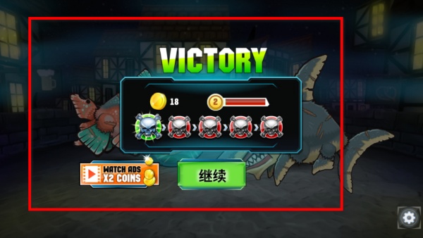 4、獲勝后會獲得金幣和等級提升等獎勵,點擊繼續按鈕可繼續參與對戰,積累更多獎勵解鎖新的變異動物。