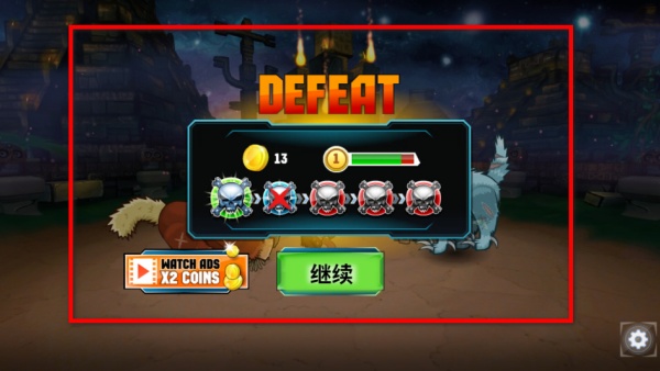 3、若對戰失敗,會獲得金幣獎勵,點擊繼續按鈕可繼續參與對戰,積累經驗和獎勵提升實力。