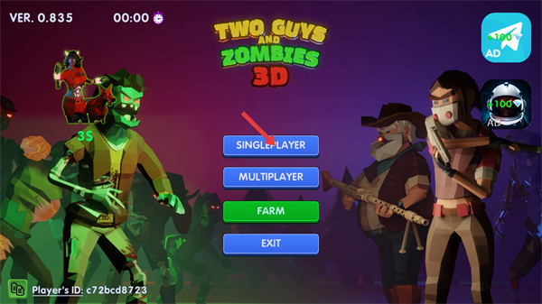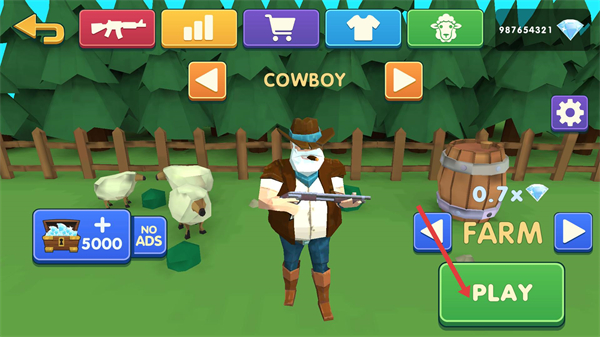 2、進入農場模式后,選定COWBOY角色,點擊PLAY按鈕即可開啟關卡,該角色擅長遠程射擊,適配農場開闊場景的戰斗。