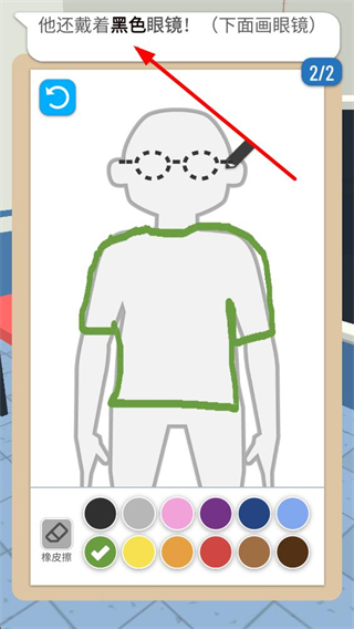 2、繼續根據提示繪制嫌疑人的黑色眼鏡,選擇黑色顏料,沿著虛線畫出眼鏡的樣式。